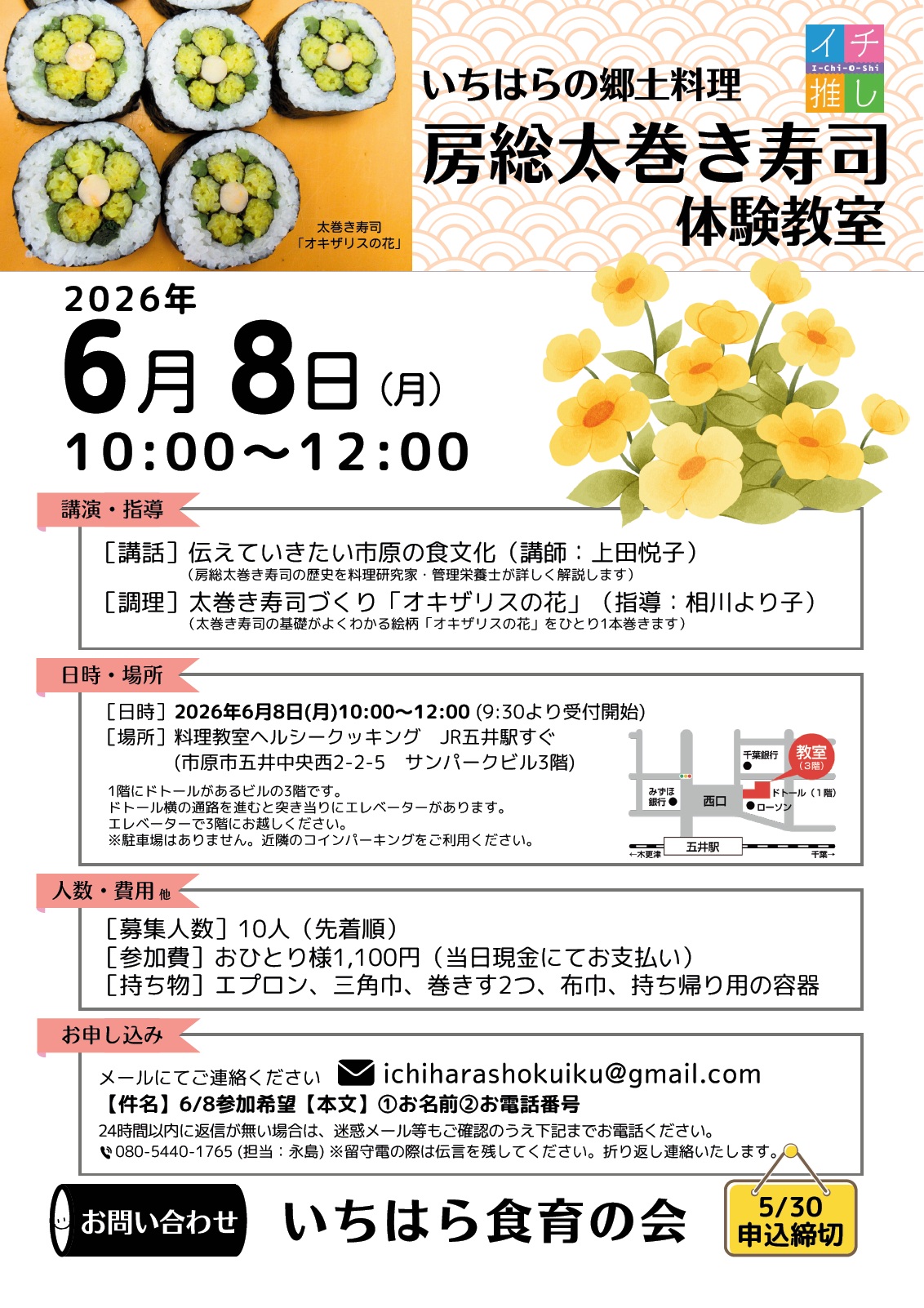 4月の房総太巻ずし教室では千葉県内の動植物園「千葉市・ゴリラ」「鴨川シーワールド・オルカ」「市原ゾウの国・ゾウ」を巻きます。体験教室もあります。