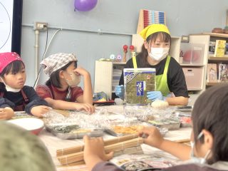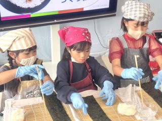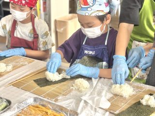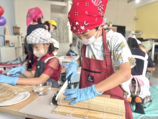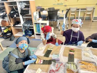 10月の初旬ですが、永島講師が「渦巻き」の太巻き寿司を教えに行ってくれました。小学生9名が自分の好きな具材を入れて、楽しく巻いたそうです。子供たちの熱心な様子や、笑顔がすてきです!! 「太巻き寿司」を作って、楽しい思い出になってくれて本当に良かったです(^-^)/