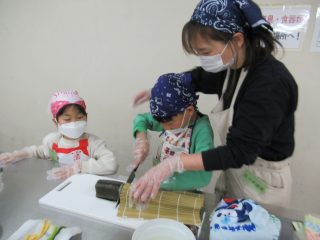 12月21日(日)に市原市立八幡公民館で「親子の太巻きずし教室」がありました。親子5組が「クリスマスツリー」と「イルミネーション」を巻きました!