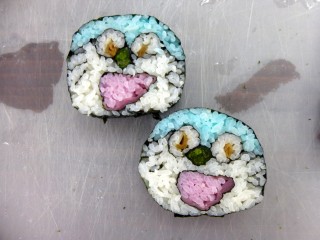 「ドラえもん」はザ・ブルーというリキュールで、青にすし飯を染めブルーの顔にしてみました。愛嬌がある「ドラえもん」ができました(^-^♪